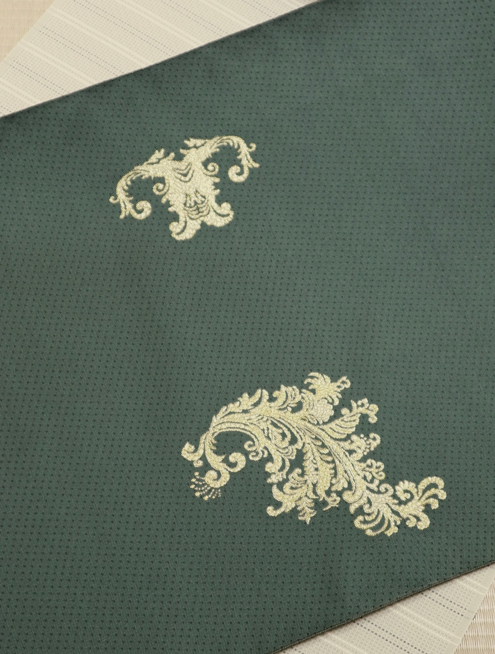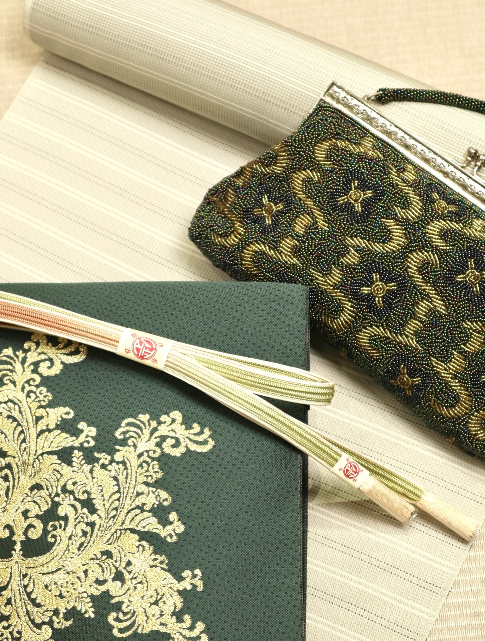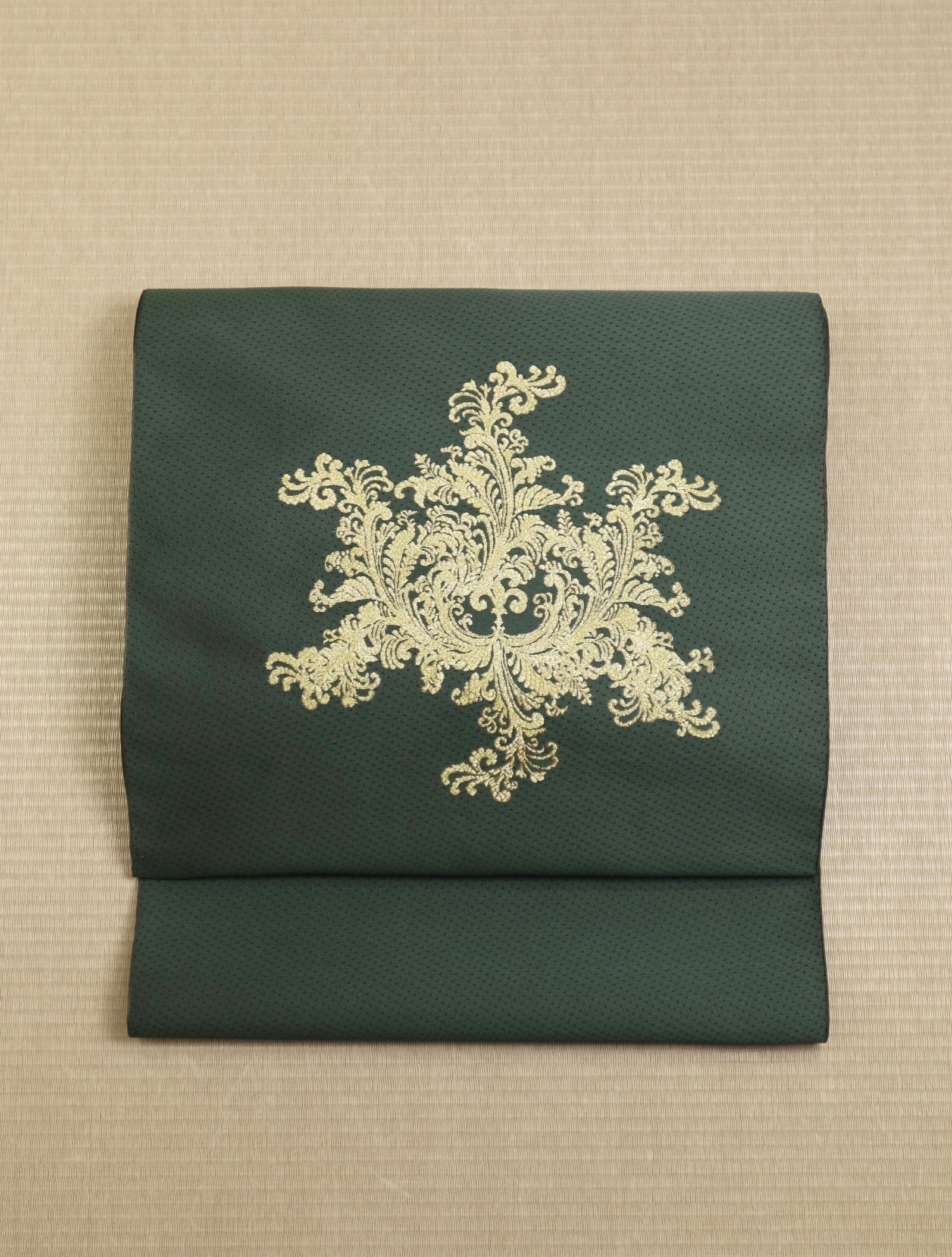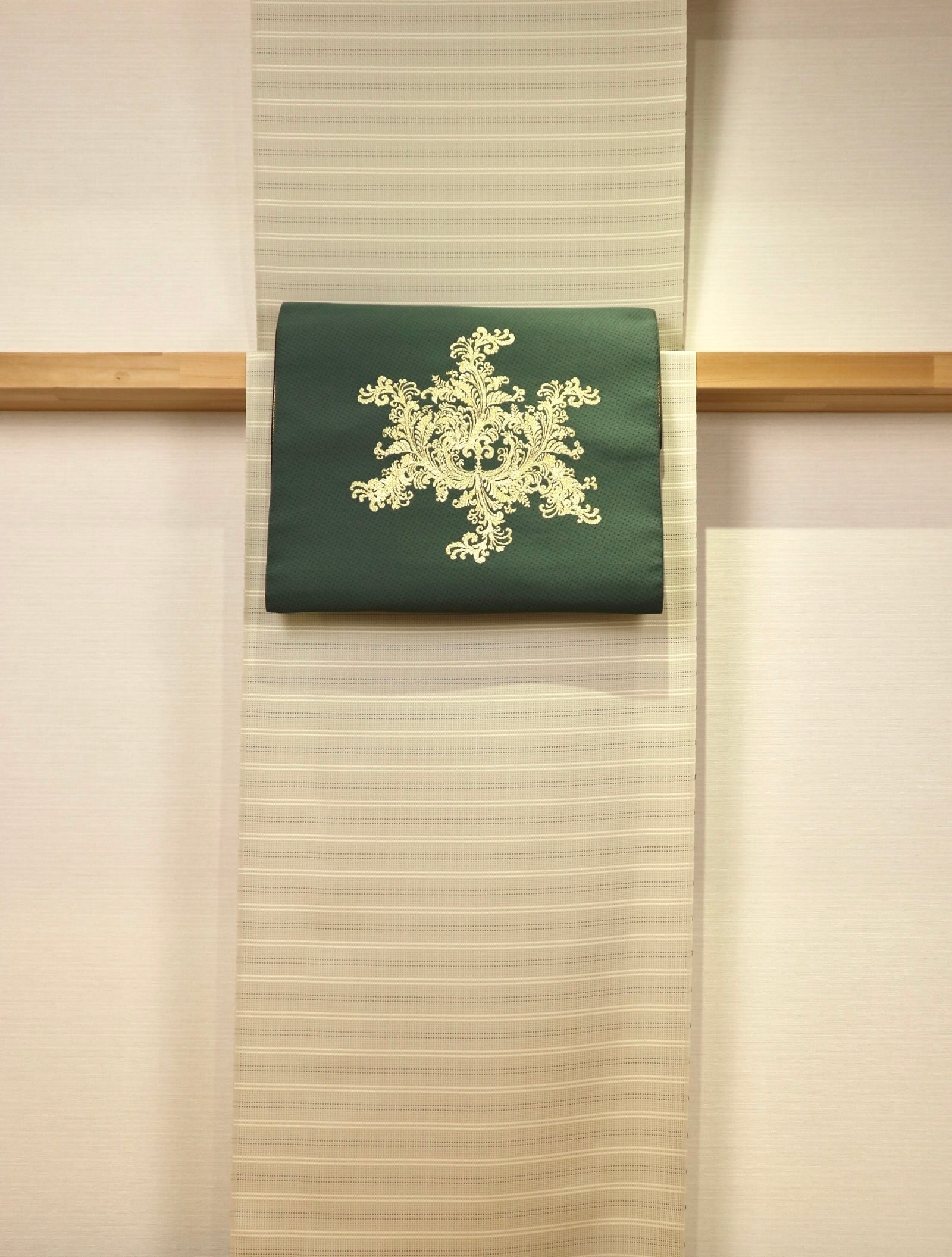 合せるのは合わせる帯は博多にしむらさんの商品で、唐草を洋風にデザインした九寸帯です。おしゃれ着として様々なお出かけにおススメできる装いとなります。