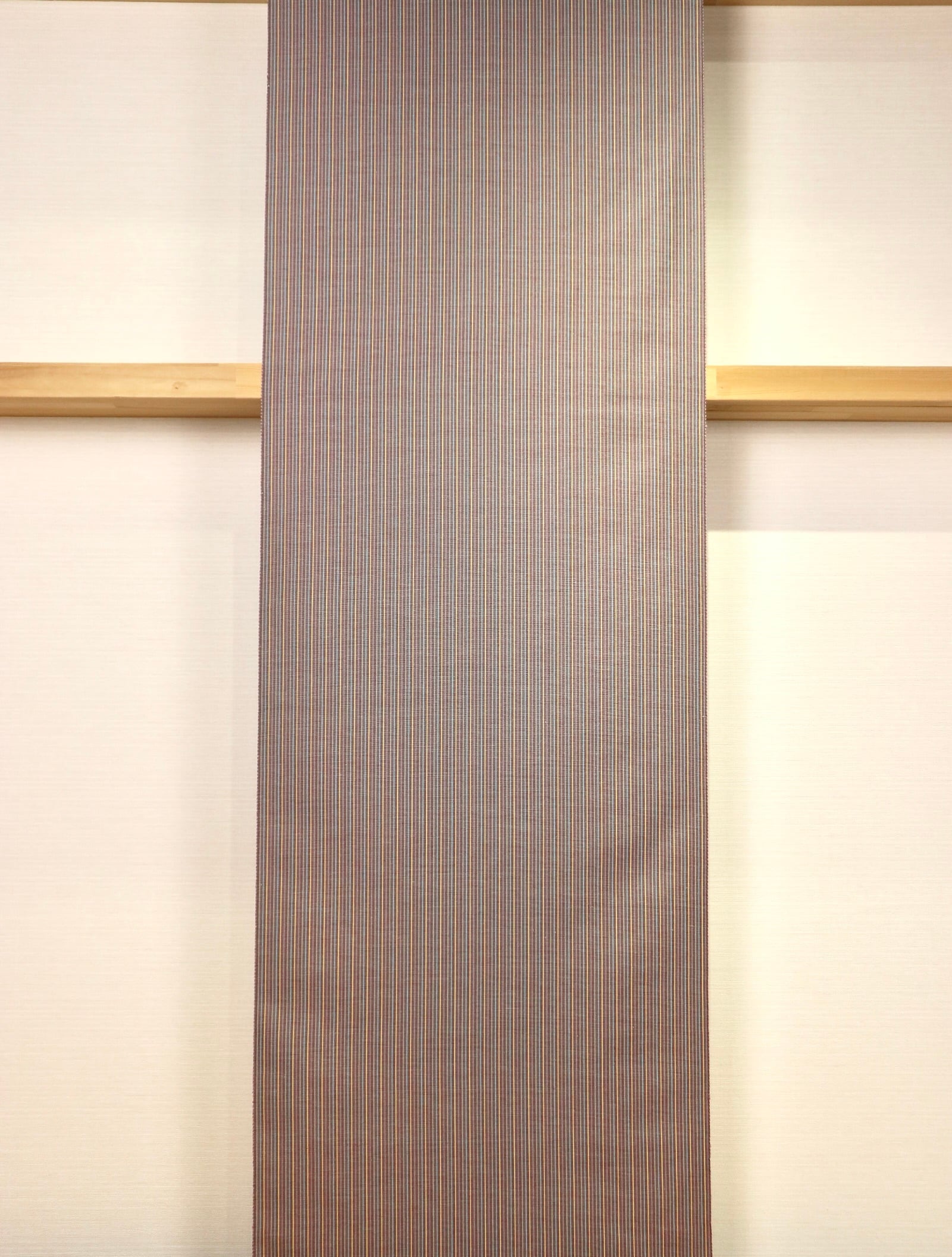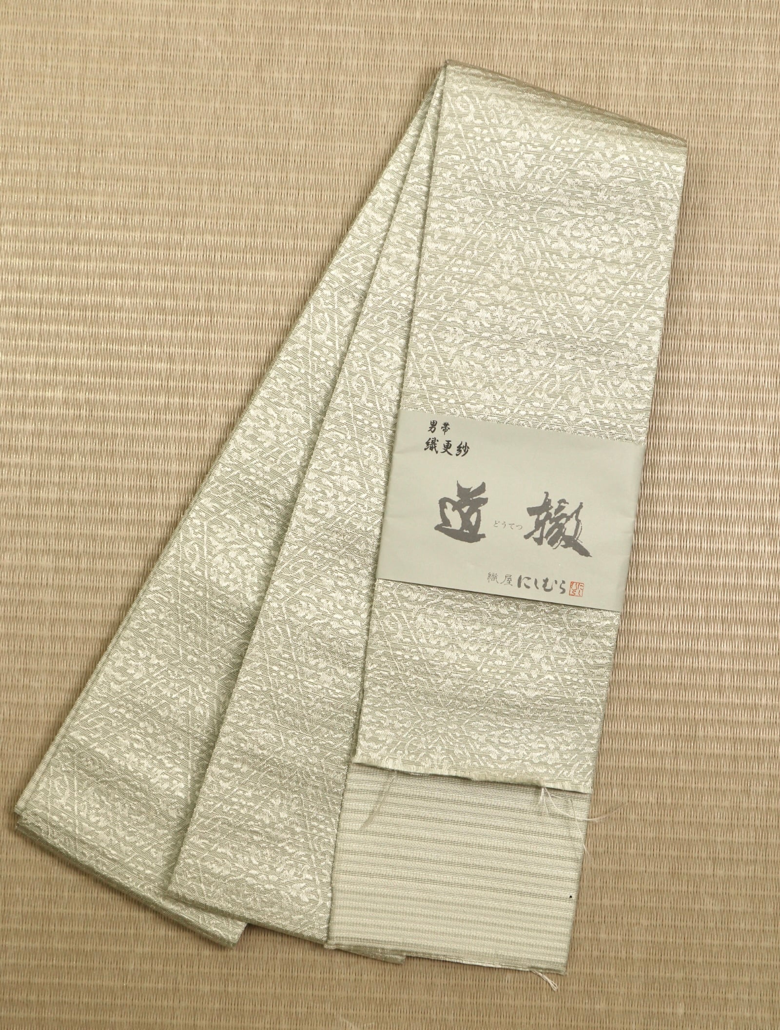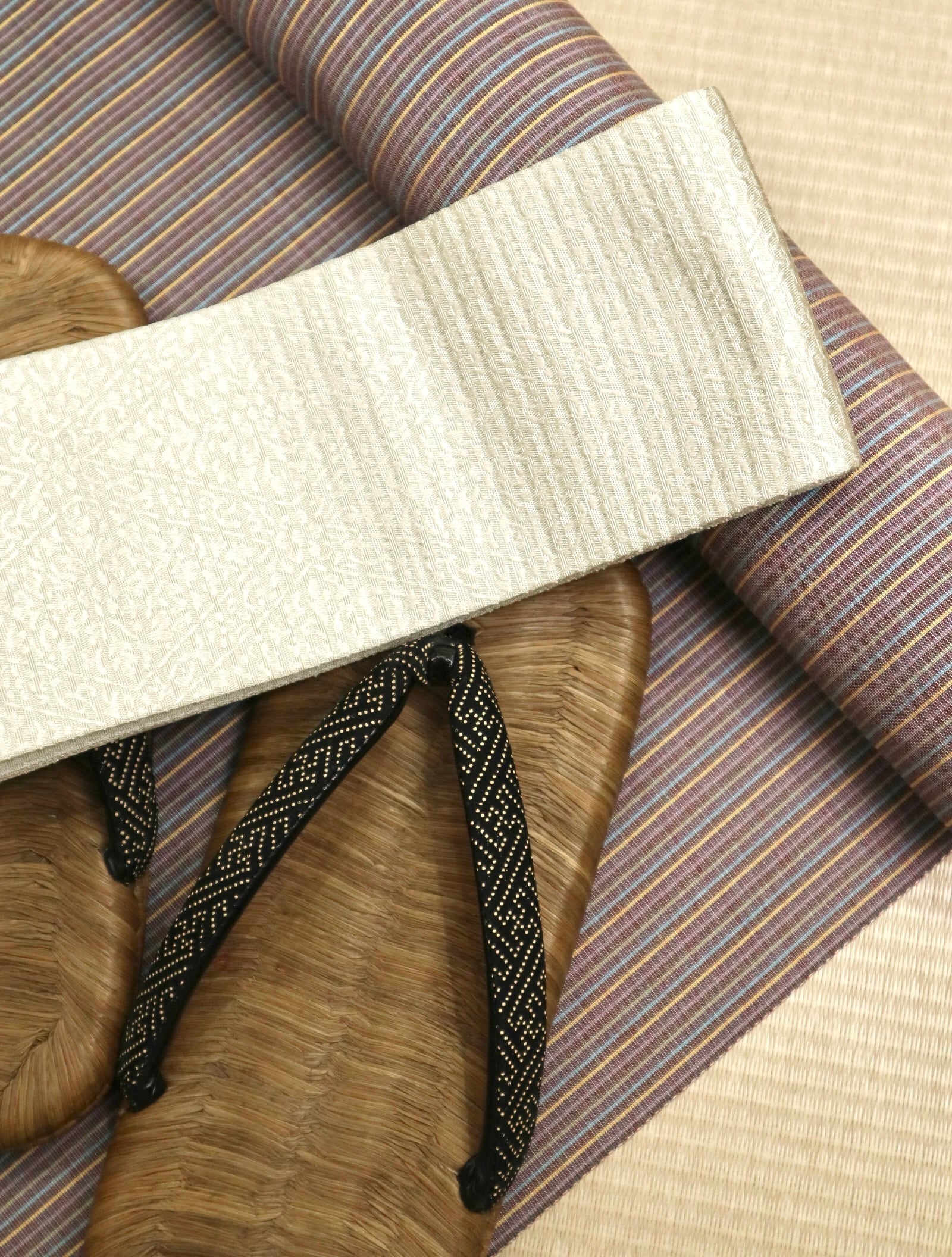 合わせる帯は博多にしむらさんの商品で、唐草文様をデザインした角帯です。おしゃれ着として様々なお出かけにおススメできる帯となります。締め心地は博多帯なので長く使ってもへたり難くキュッと締まって気持ちの良締め心地です。