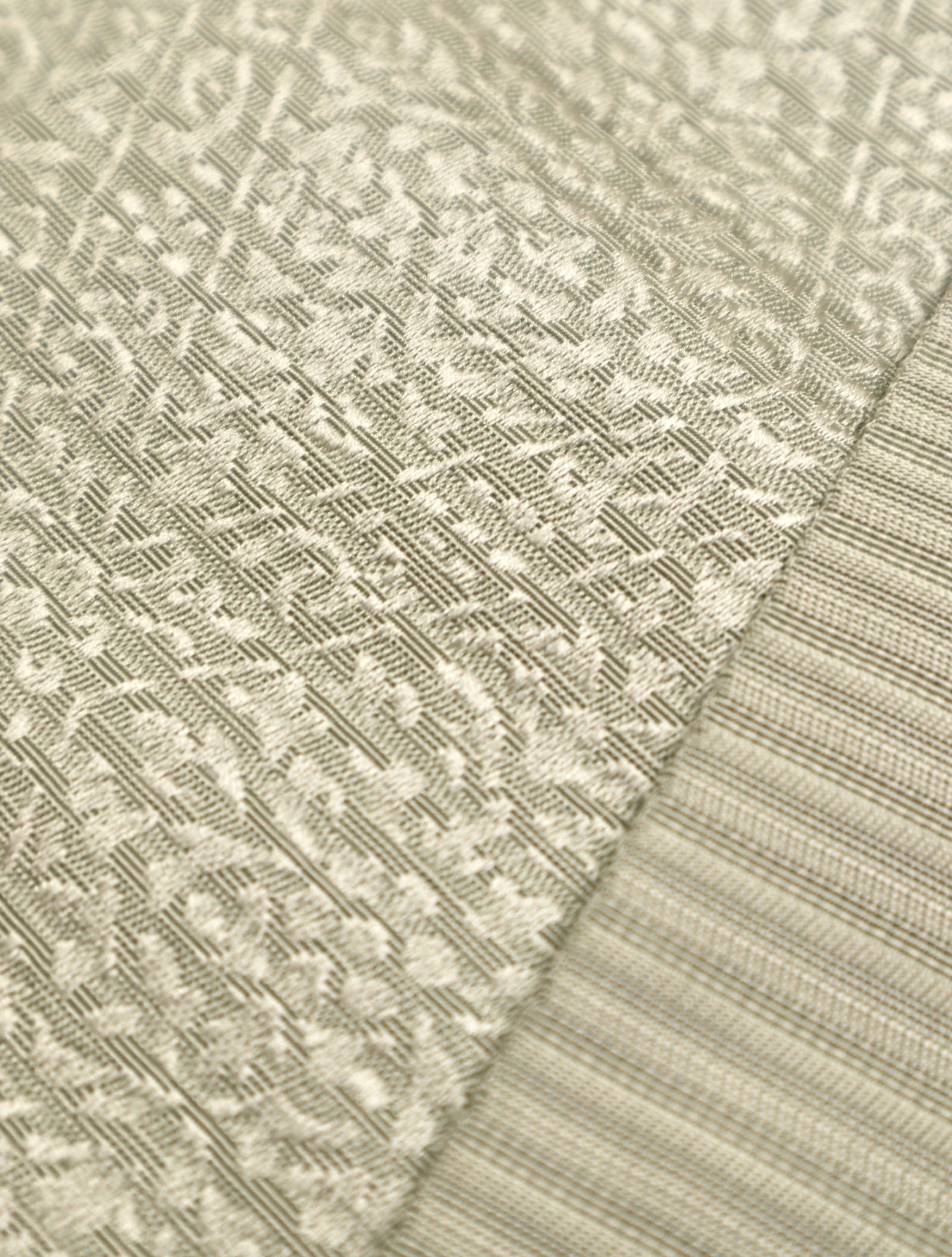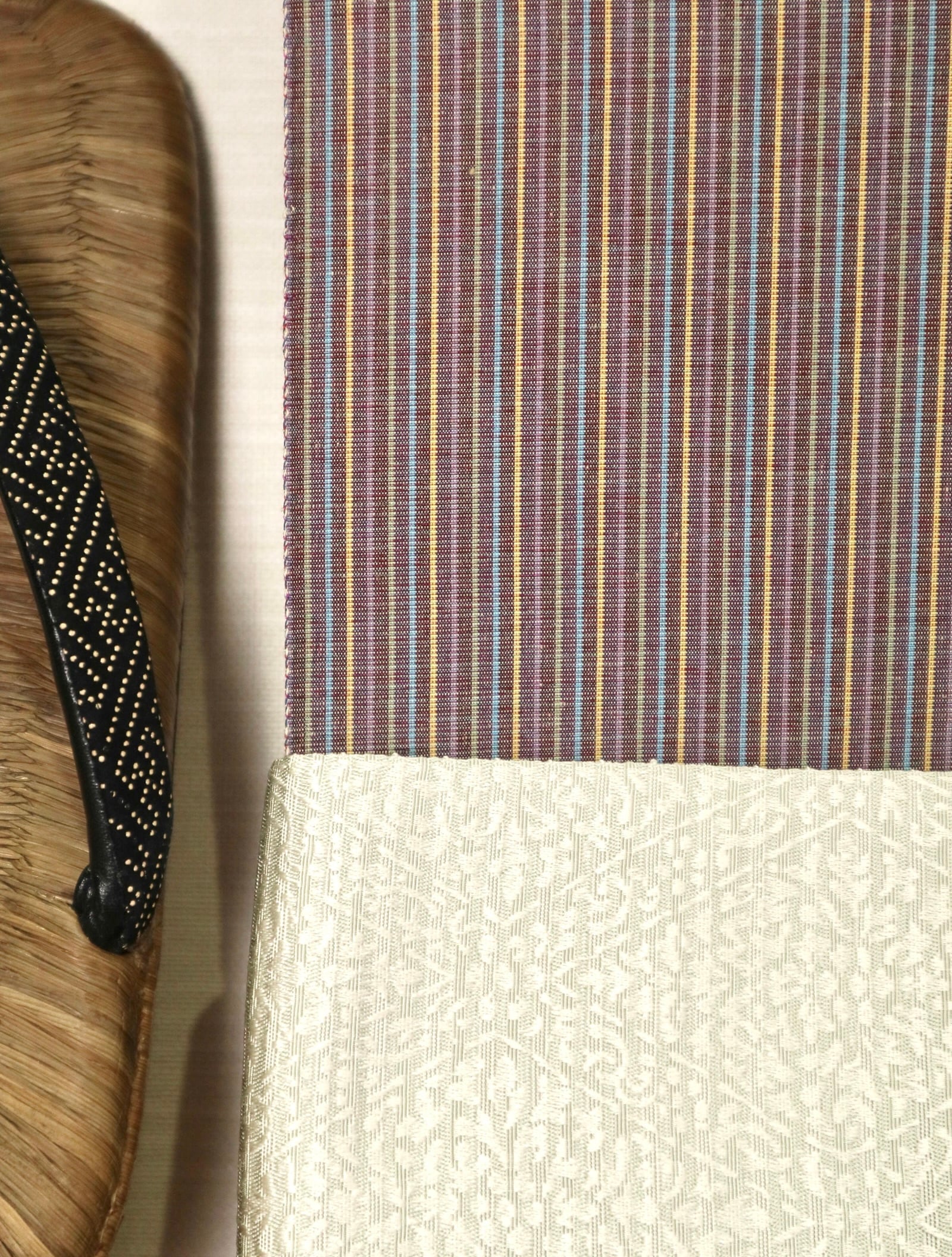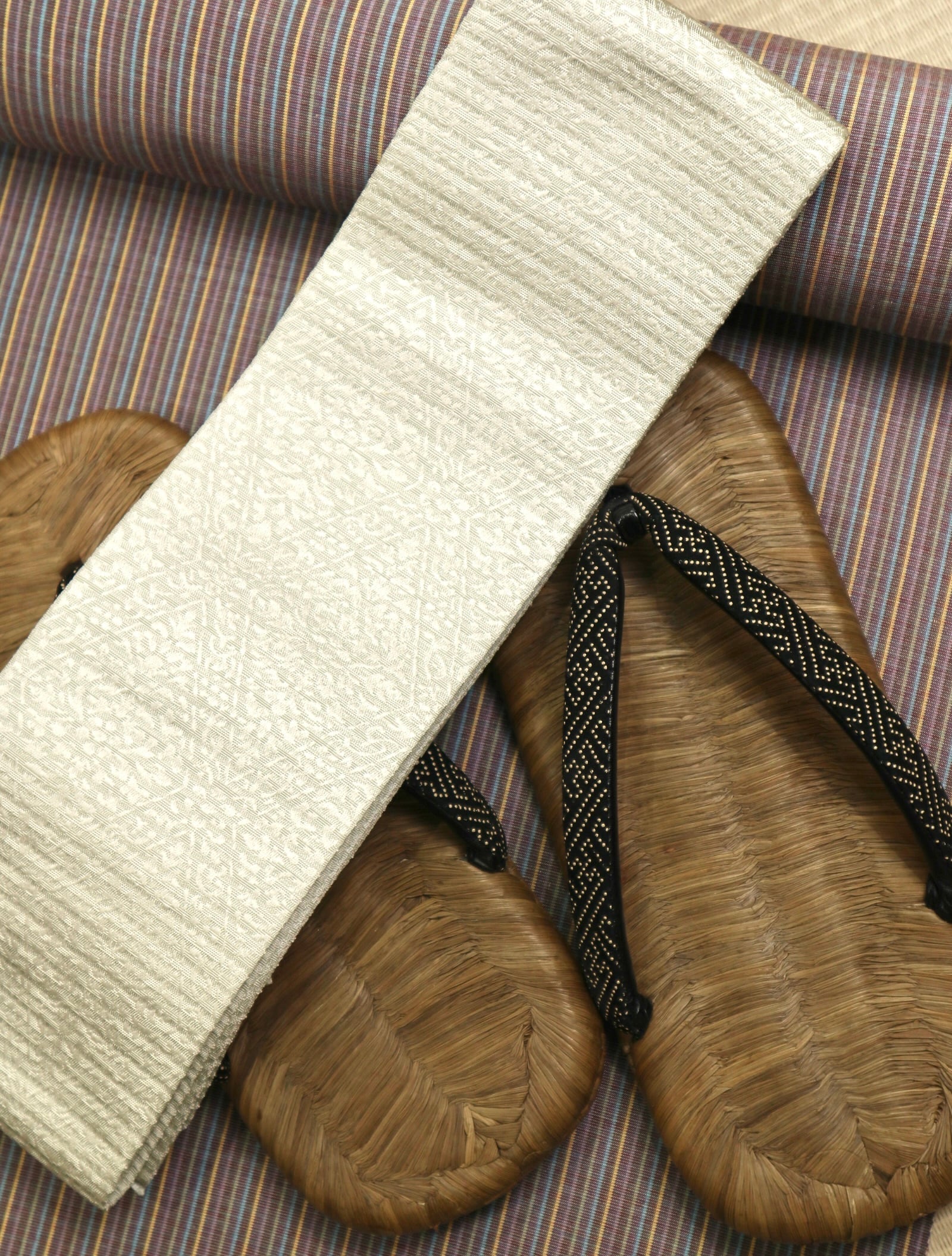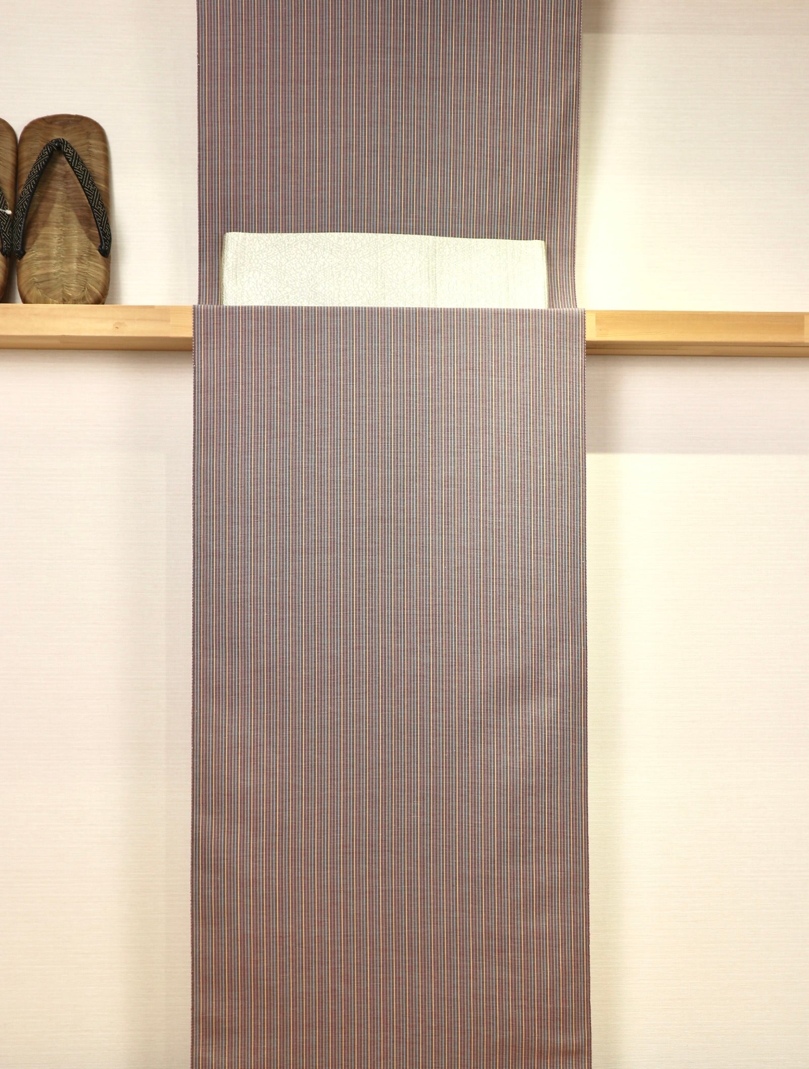 合わせる帯は博多にしむらさんの商品で、唐草文様をデザインした角帯です。おしゃれ着として様々なお出かけにおススメできる帯となります。締め心地は博多帯なので長く使ってもへたり難くキュッと締まって気持ちの良締め心地です。
