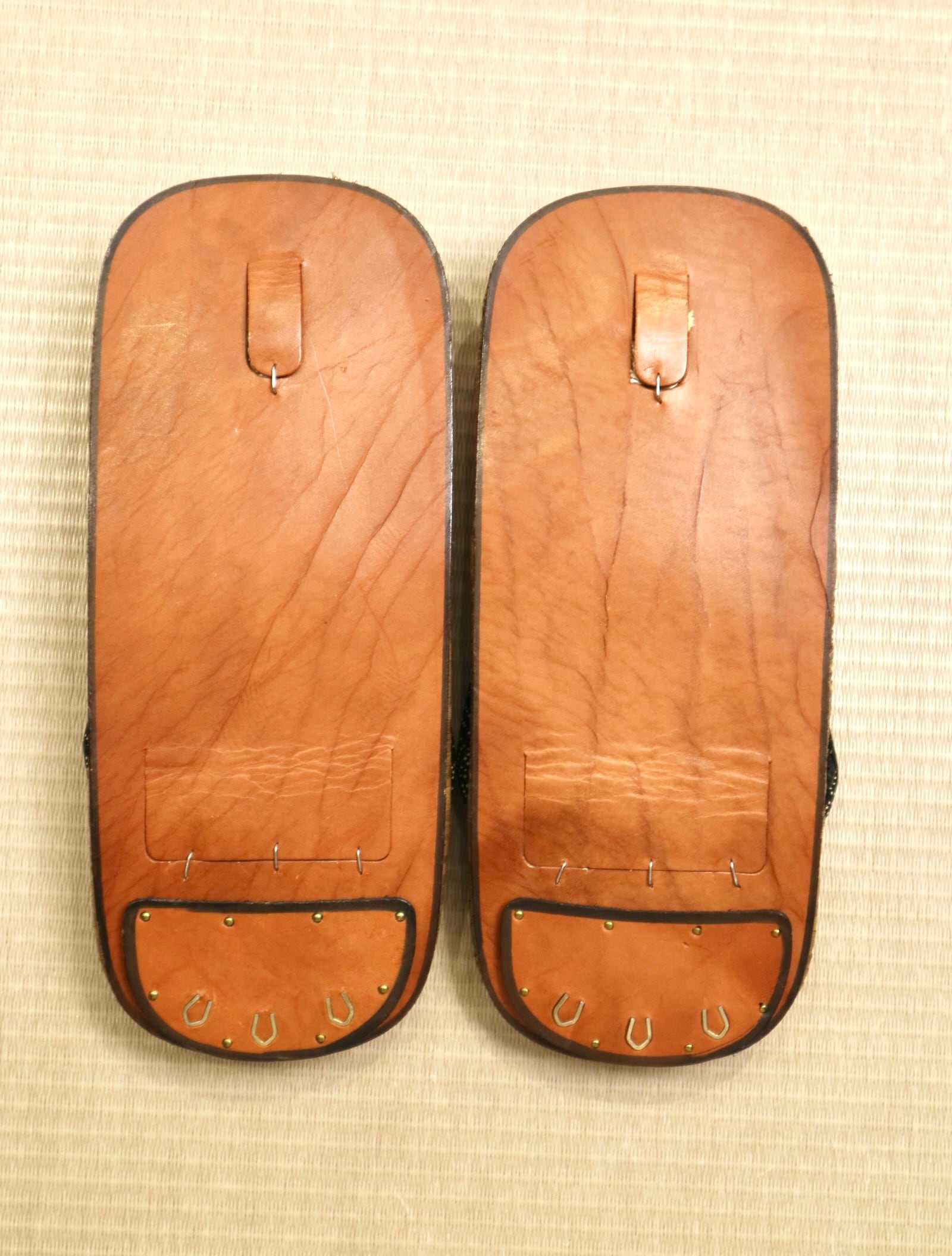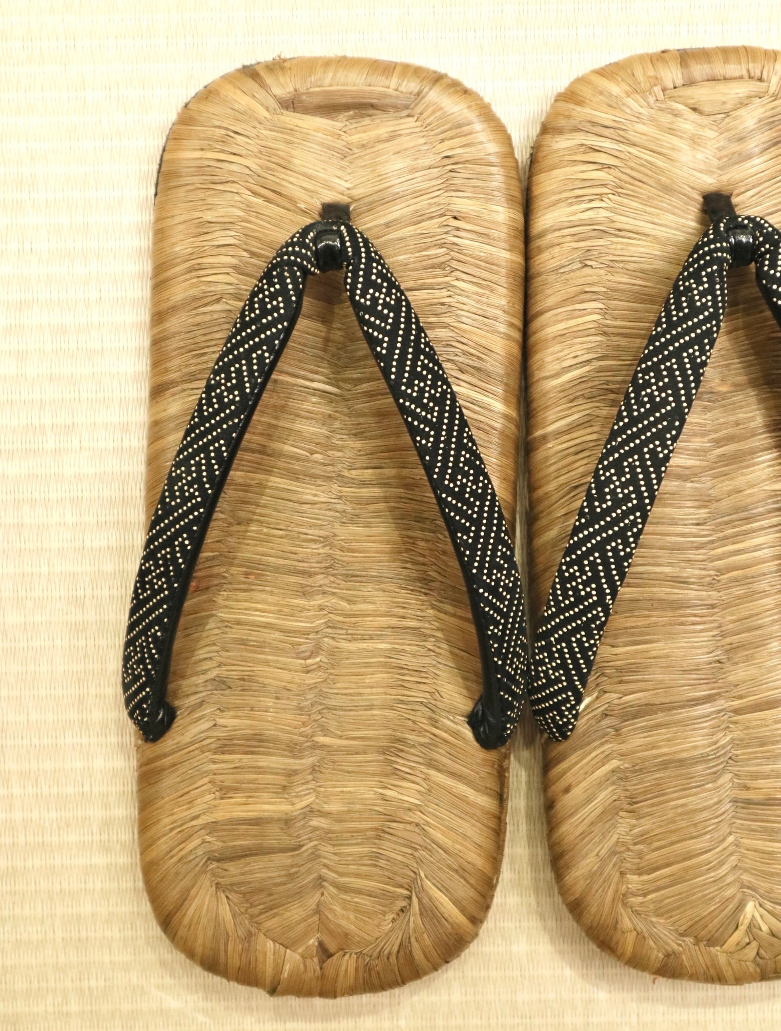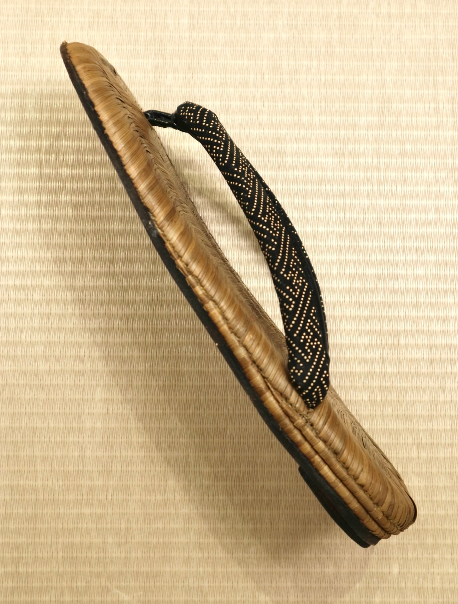 雪駄は三段重ね深染(カラス)で印伝風の花緒で粋な着こなしにオススメな逸品です。
