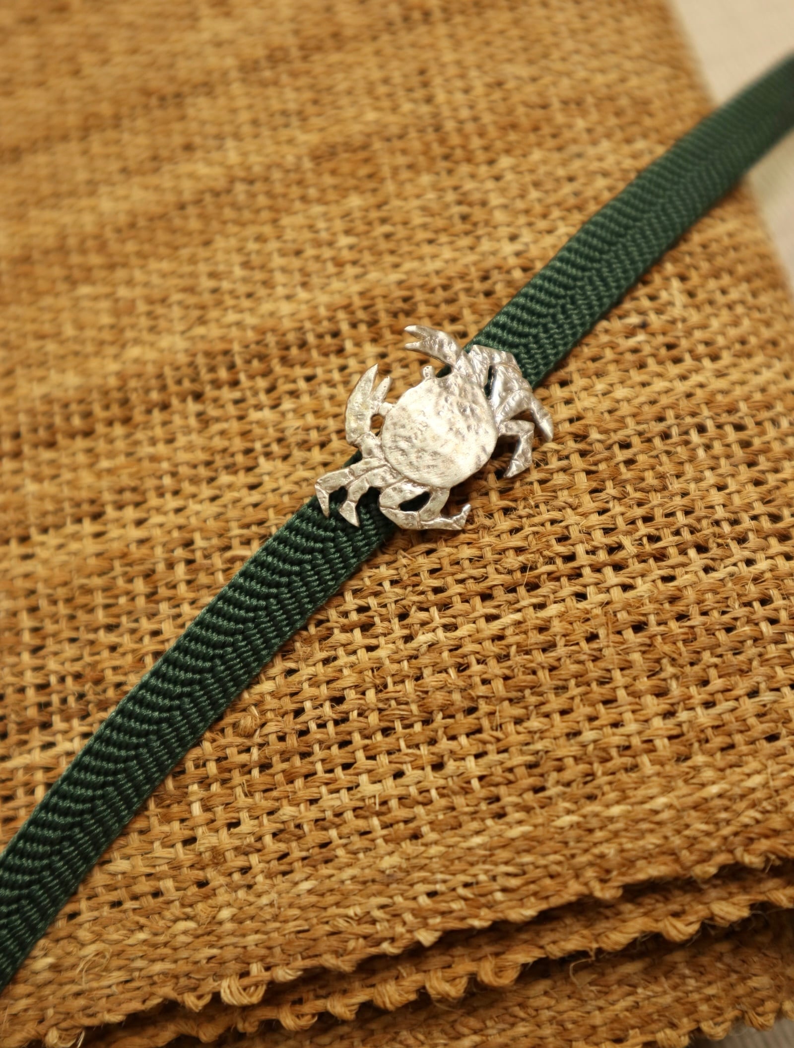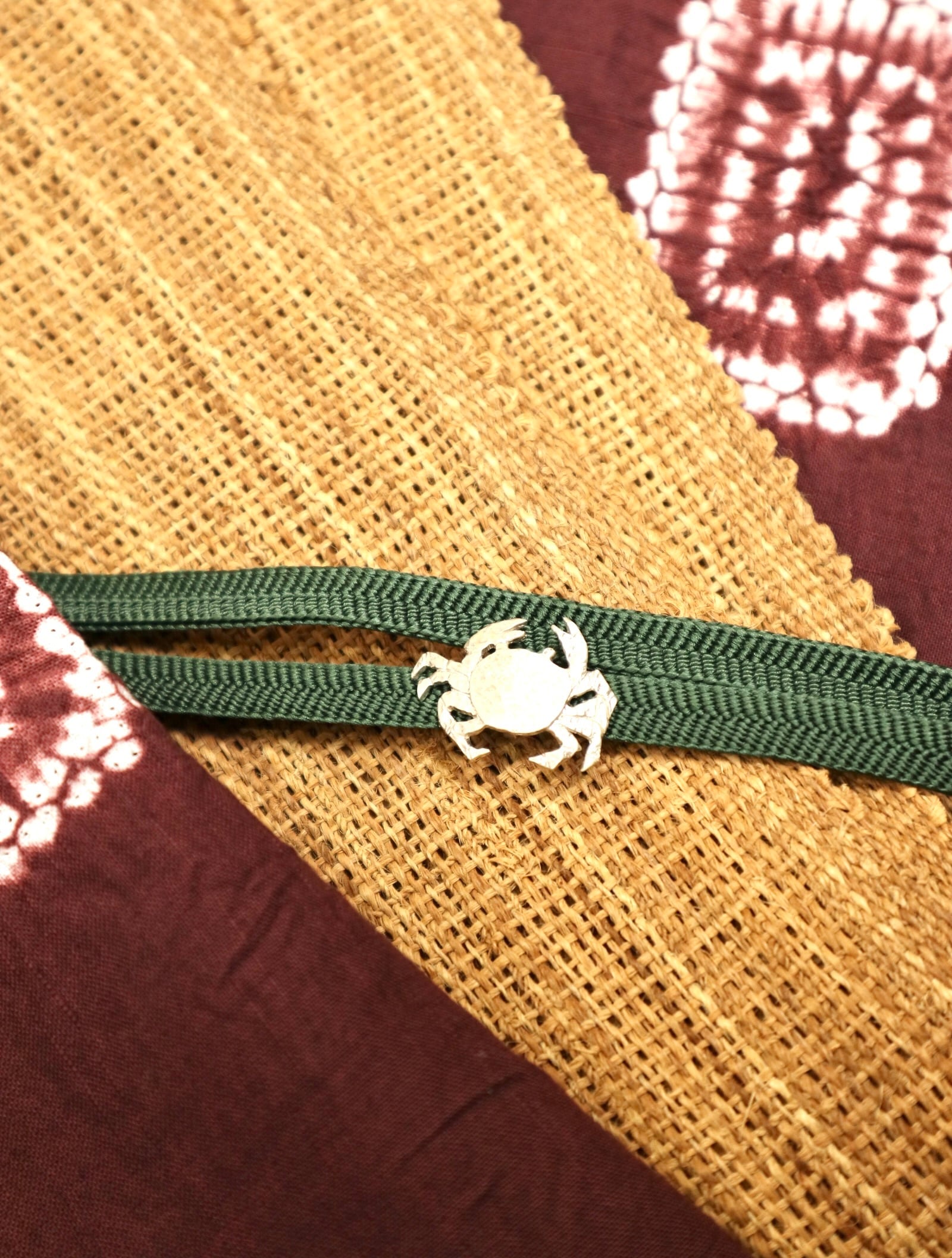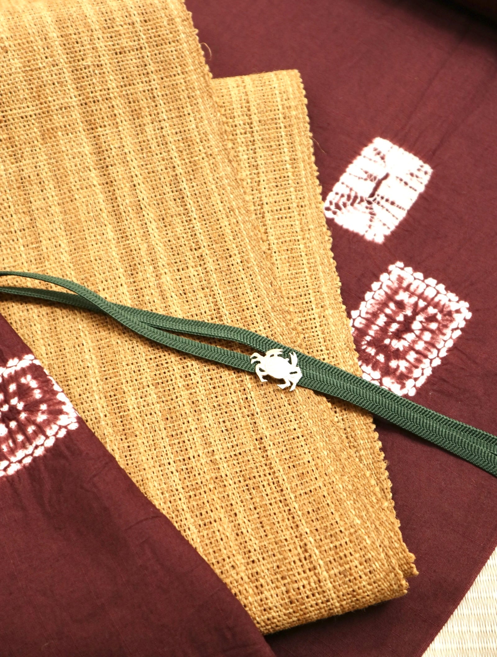 シナ布の様な自然素材には異素材の金属やガラスの帯留めが映えます。
