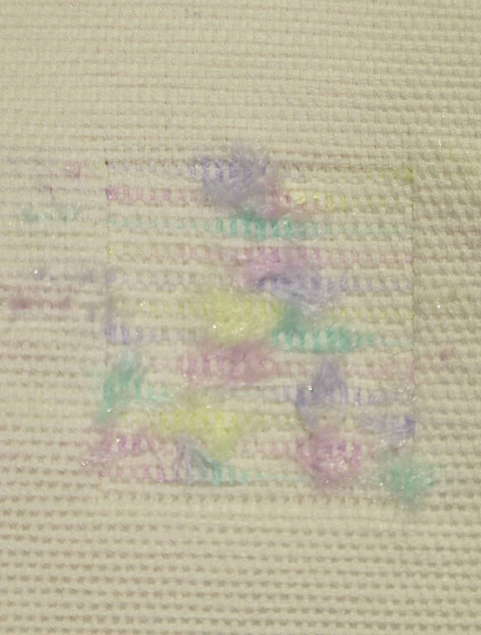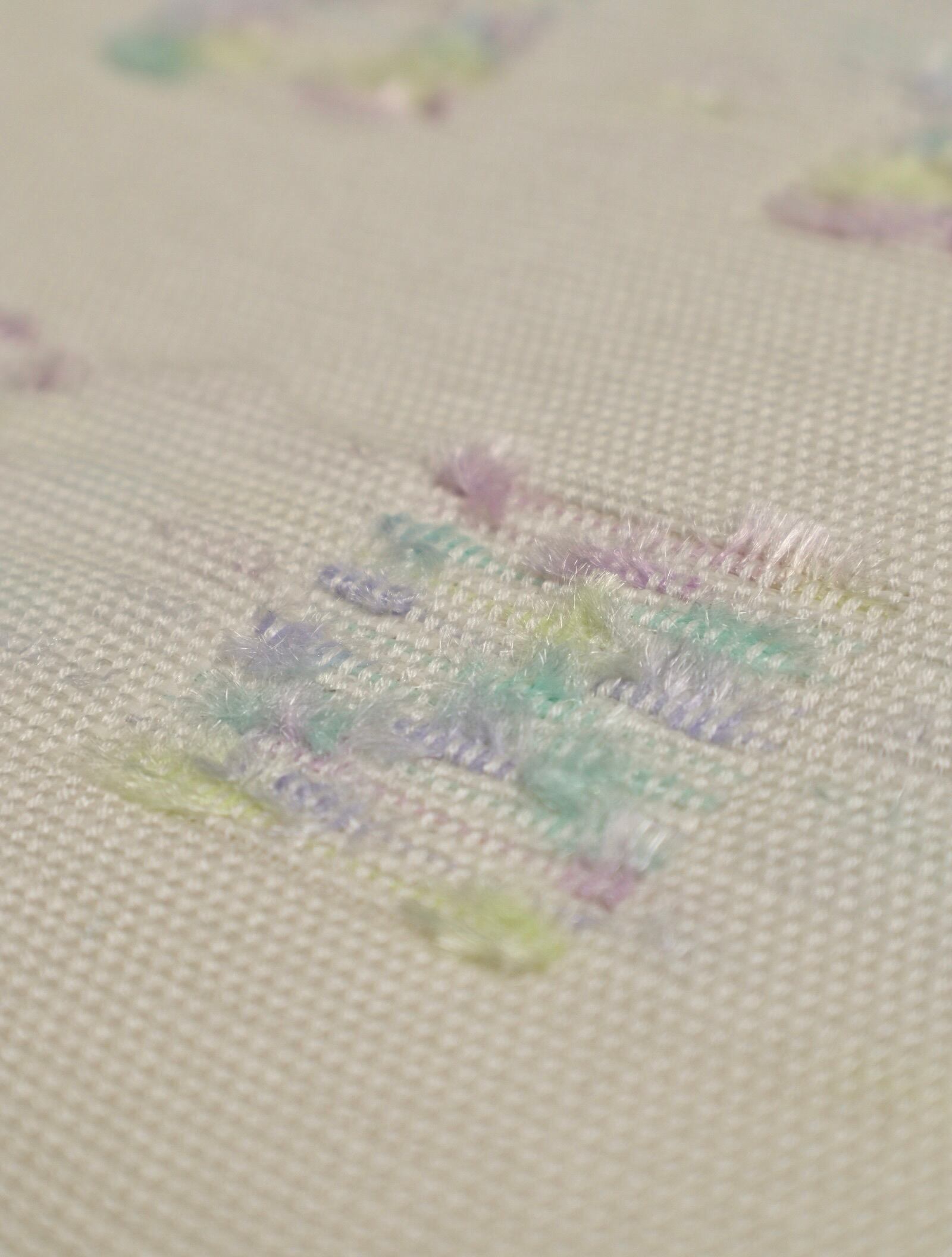 清らかな白地に、パステルカラーのモールのような糸を織り込んだ八寸名古屋帯です。