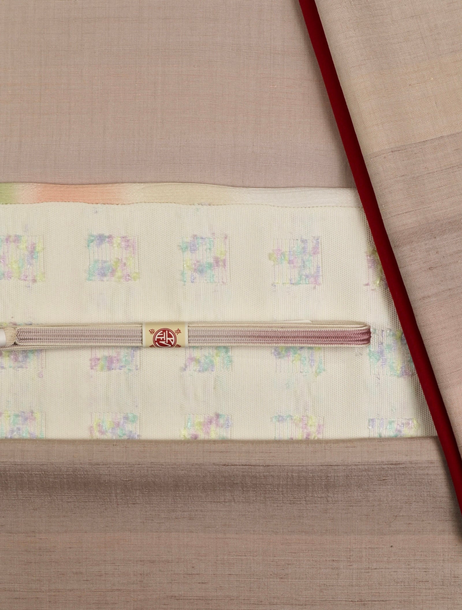 規則正しく並ぶスクエアからのぞくその様子は、可愛らしさと凛とした清廉さを感じさせる帯です。